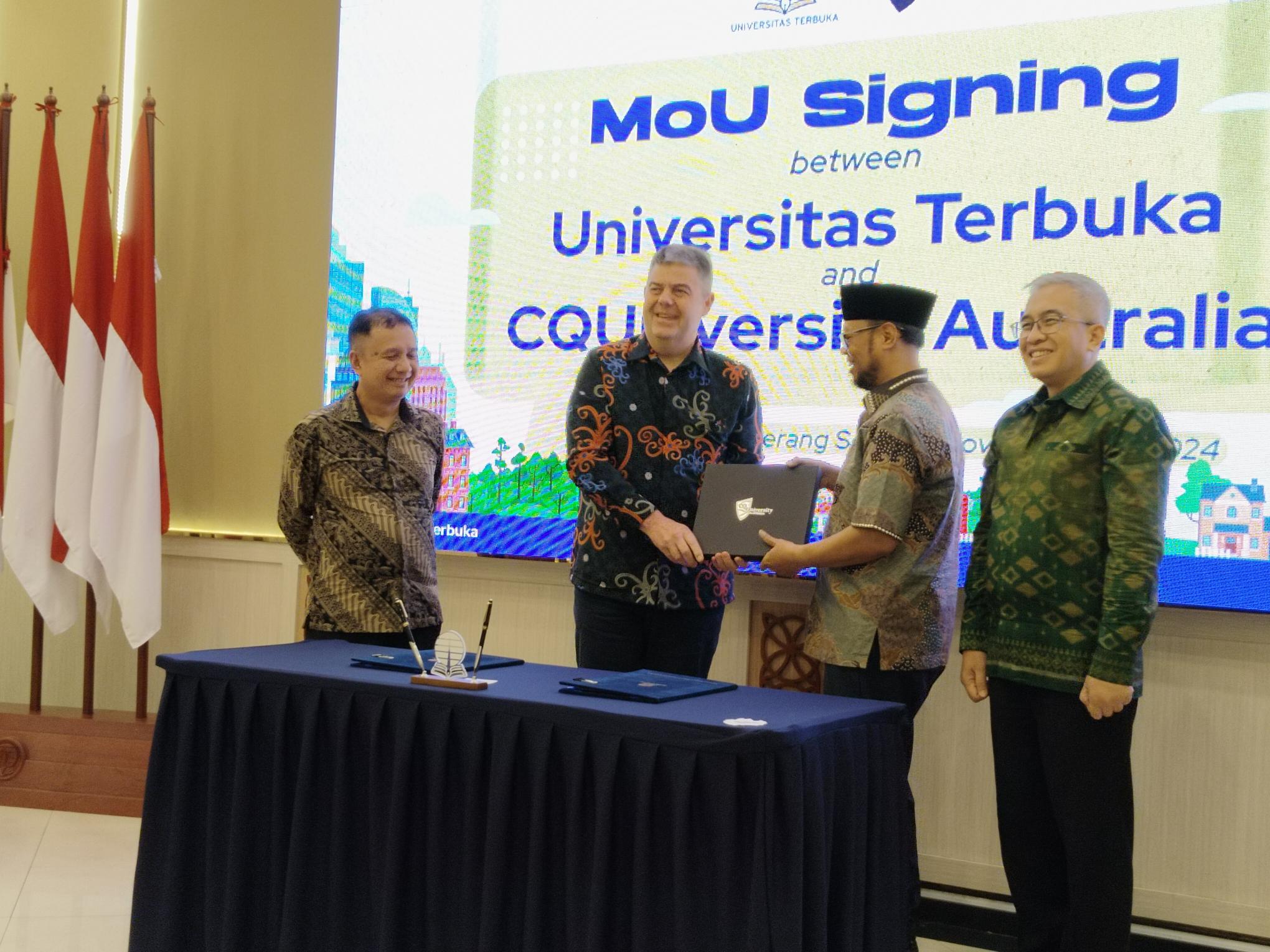 Puncak acara berlangsung pukul 09.55 WIB, ketika Rektor Universitas Terbuka dan Presiden CQU Indonesia secara resmi menandatangani MoU. Proses ini menjadi simbol komitmen bersama untuk mempererat hubungan akademik, riset, dan pengembangan program pendidikan yang berorientasi pada inovasi.